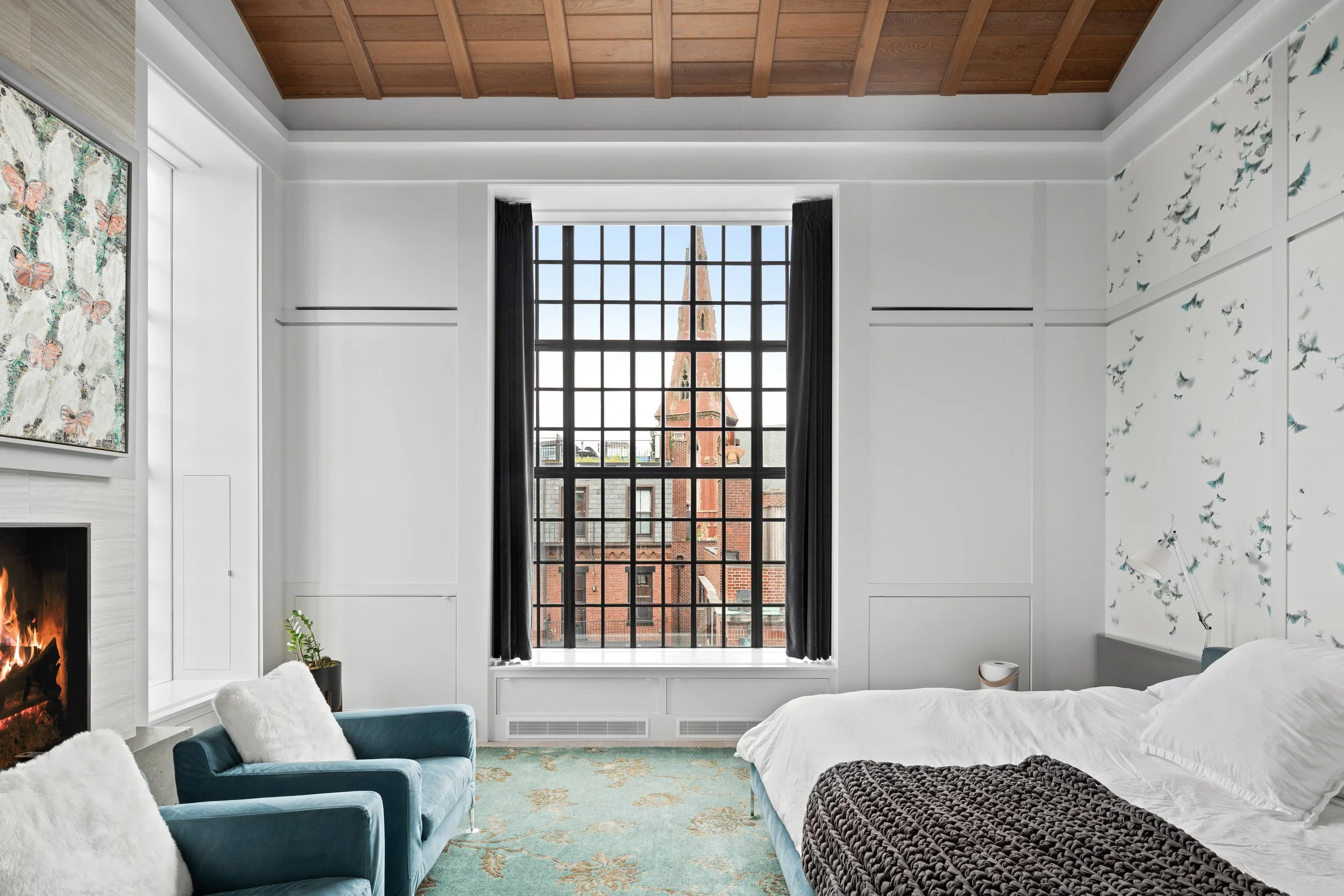 The fireplace can display art and has an art lift to reveal a tv opposite the bed